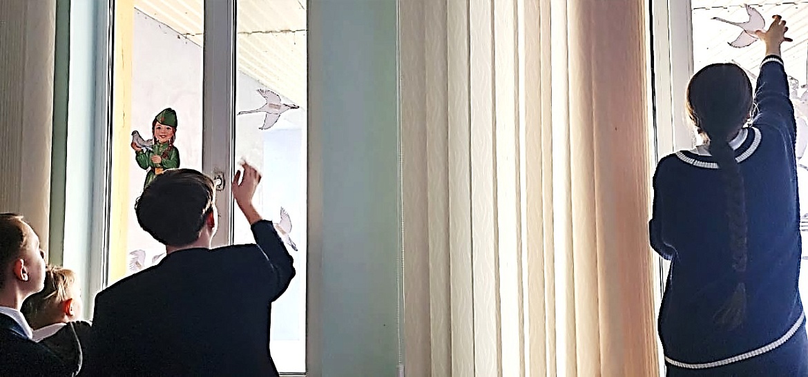 Учащиеся 6 -7 классов ЧОУ «Перфект – гимназия» вооружившись картоном, белой бумагой, ножницами, клеем изготовлевали белых журавлей и украсили ими окна классов.