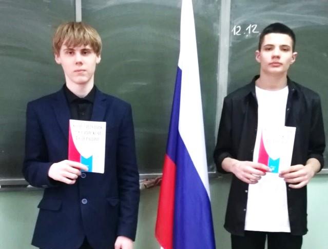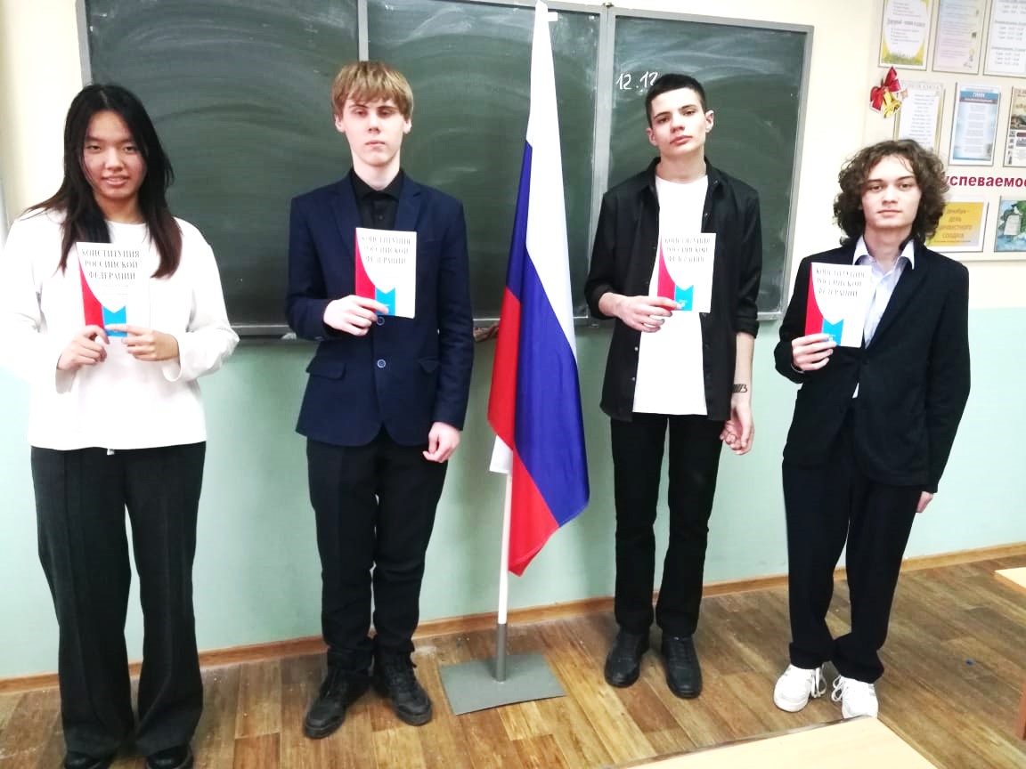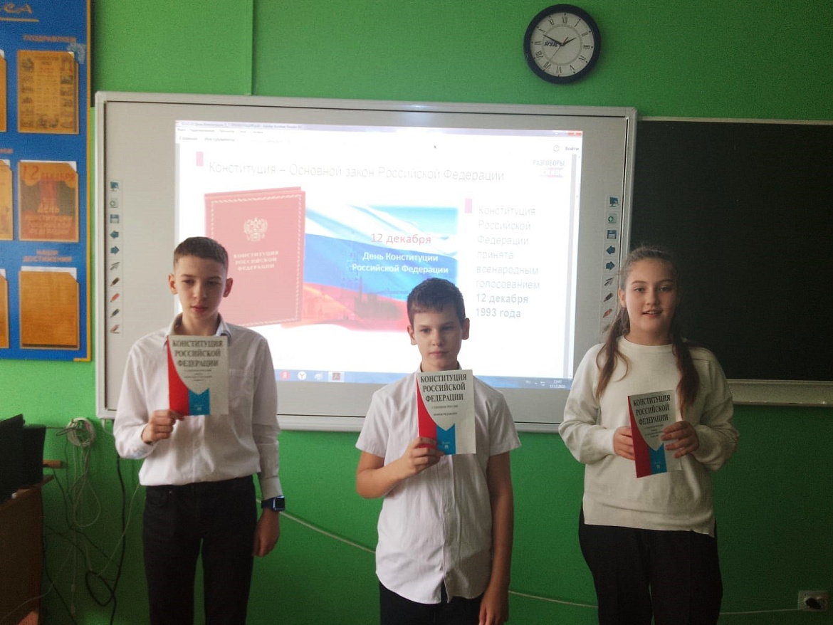 Классный руководитель 9 класса Коковина И.В., открывая урок, сказала: «День Конституции – это одна из самых значимых дат нашего государства. Она была принята почти 30 лет назад – 12 декабря 1993 г. В этой небольшой книжке заложен прочный фундамент демократического развития российского государства. Первый экземпляр под номером один Конституции России представляет собой переплет из тончайшей кожи красного цвета с накладным серебряным гербом России и золотой надписью «Конституция Российской Федерации». Этот экземпляр, так называемое инаугурационное издание Конституции РФ, хранится в библиотеке главы государства в Кремле.