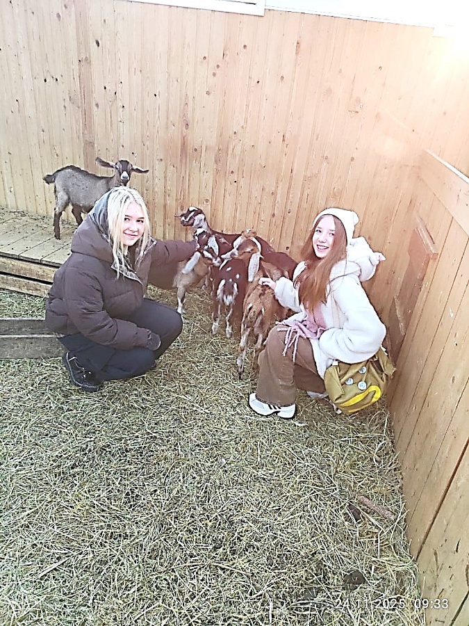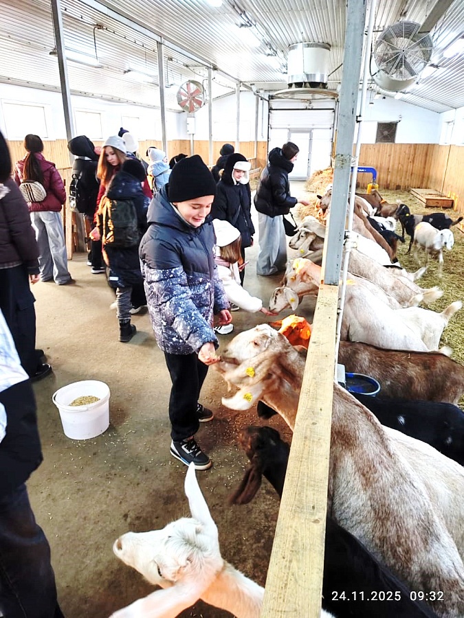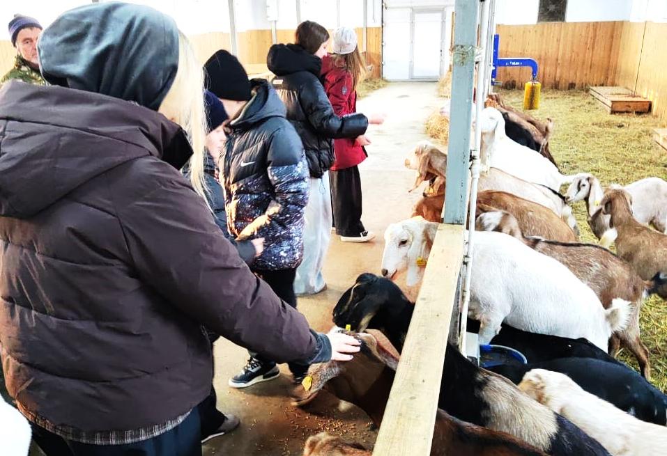 В ходе экскурсии ребята посетили загон, где содержат и доят коз, увидели и сам процесс доения. Но больше всего ребят удивило то, что каждая козочка знает куда идти и как становиться на специальную платформу, где доярка надевает козам присоски, откачивающие молоко, и процесс дойки запущен.