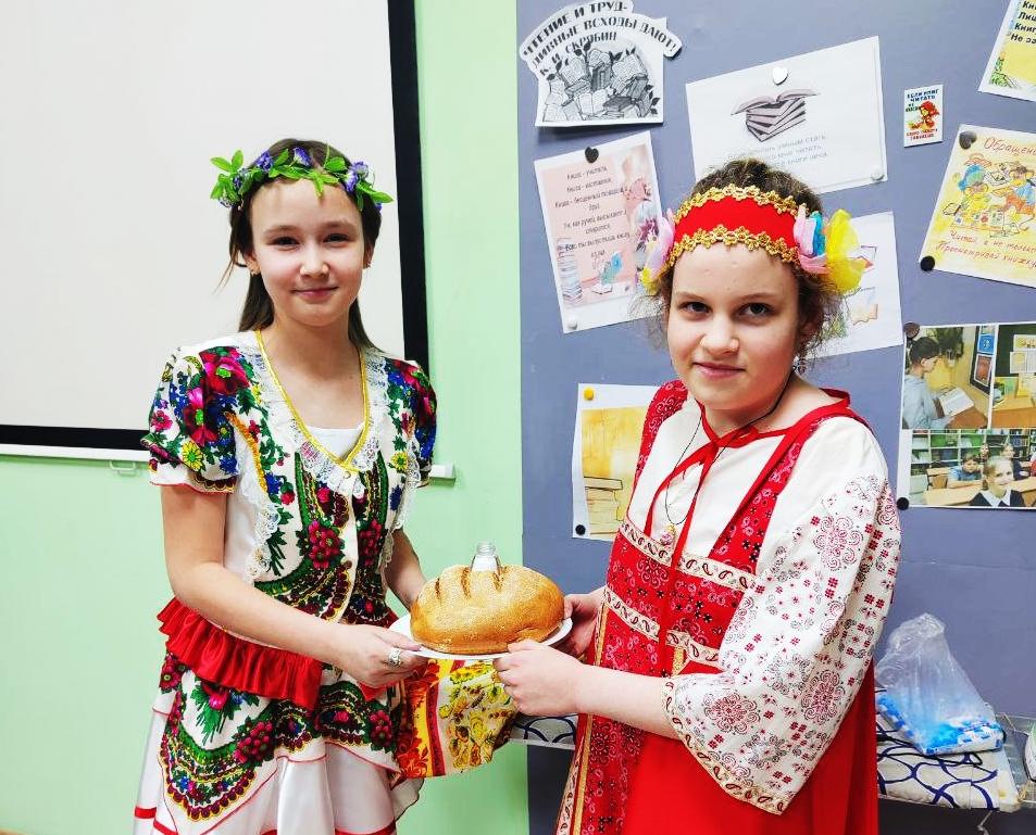 Первыми открыли фестиваль учащиеся 10 класса. С караваем хлеба и солью, в русских народных костюмах, они представили самый многочисленный народ России – русские.