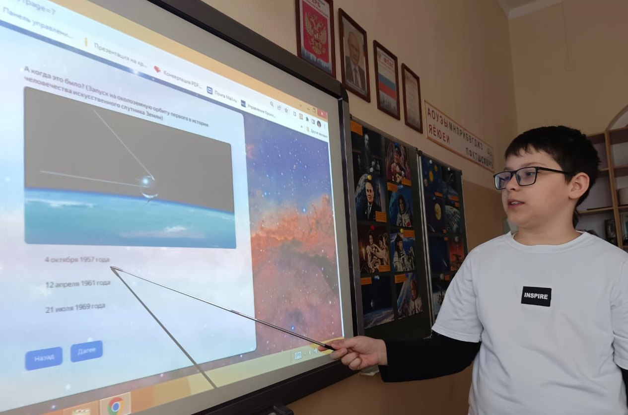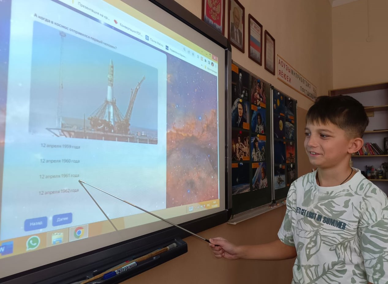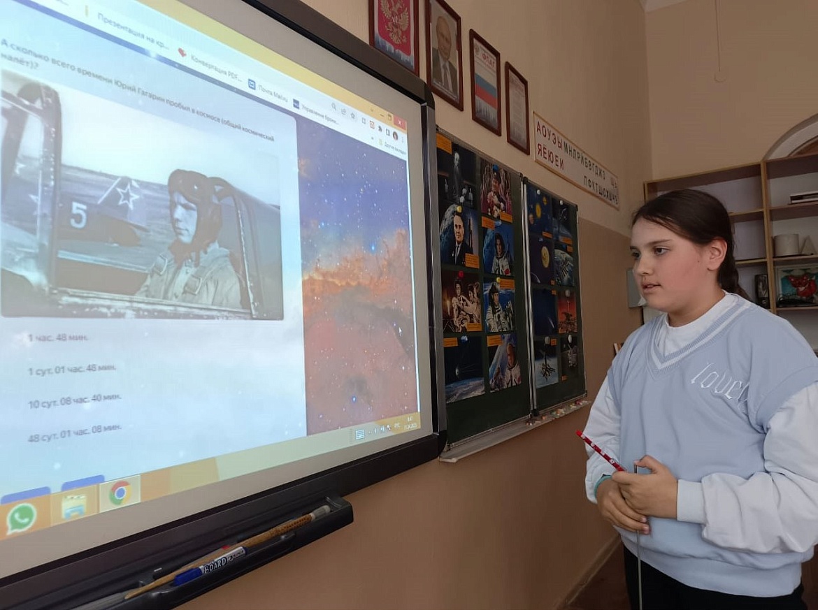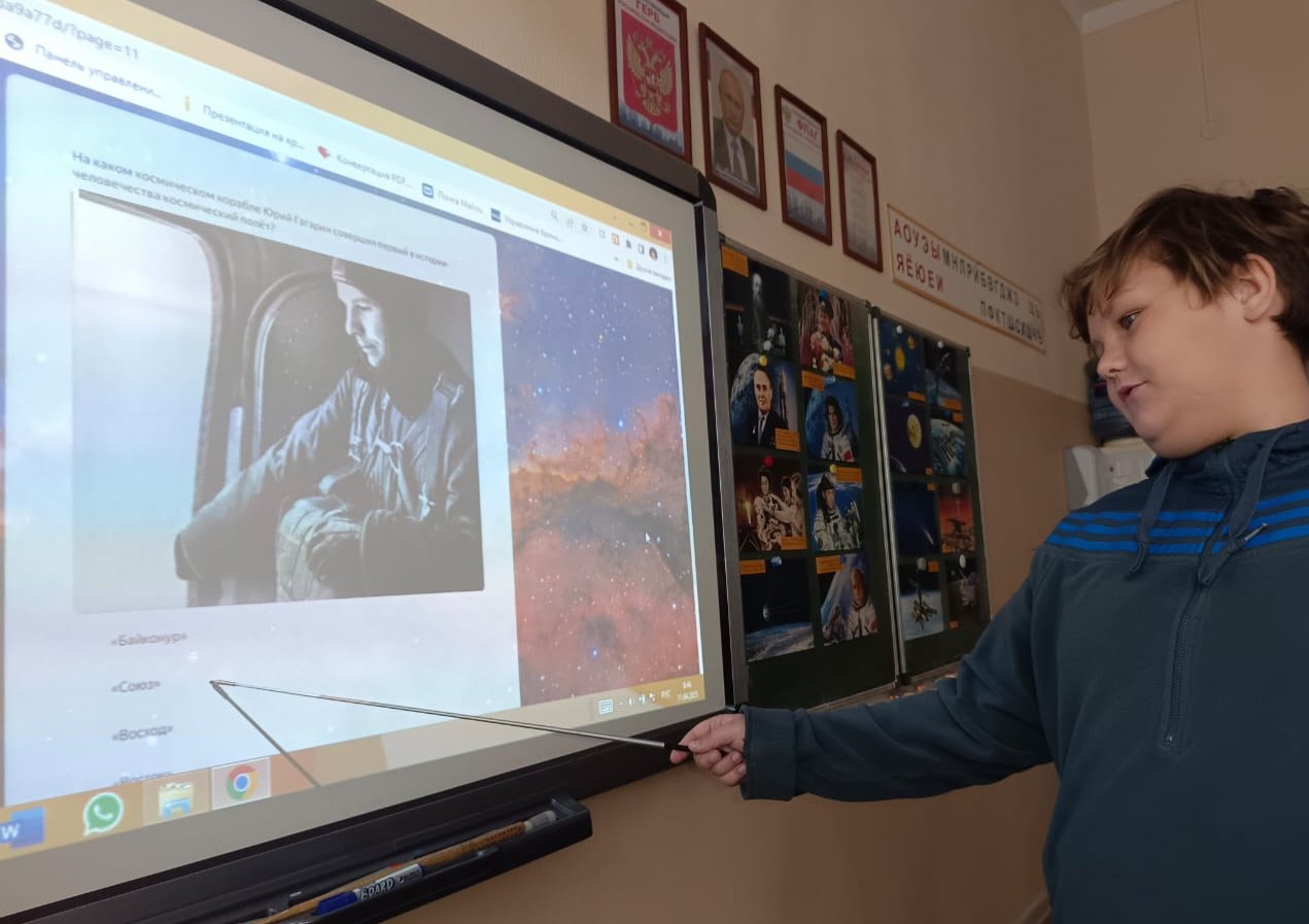 Учащиеся узнали об истории освоения космоса от древних времён до наших дней, о жизни Юрия Алексеевича Гагарина. Вспомнили имена космонавтов и российских ученых, которые внесли неоценимый вклад в российскую космонавтику. Узнали о полетах верных друзей человека – собаках Лайке, Стрелке и Белке.