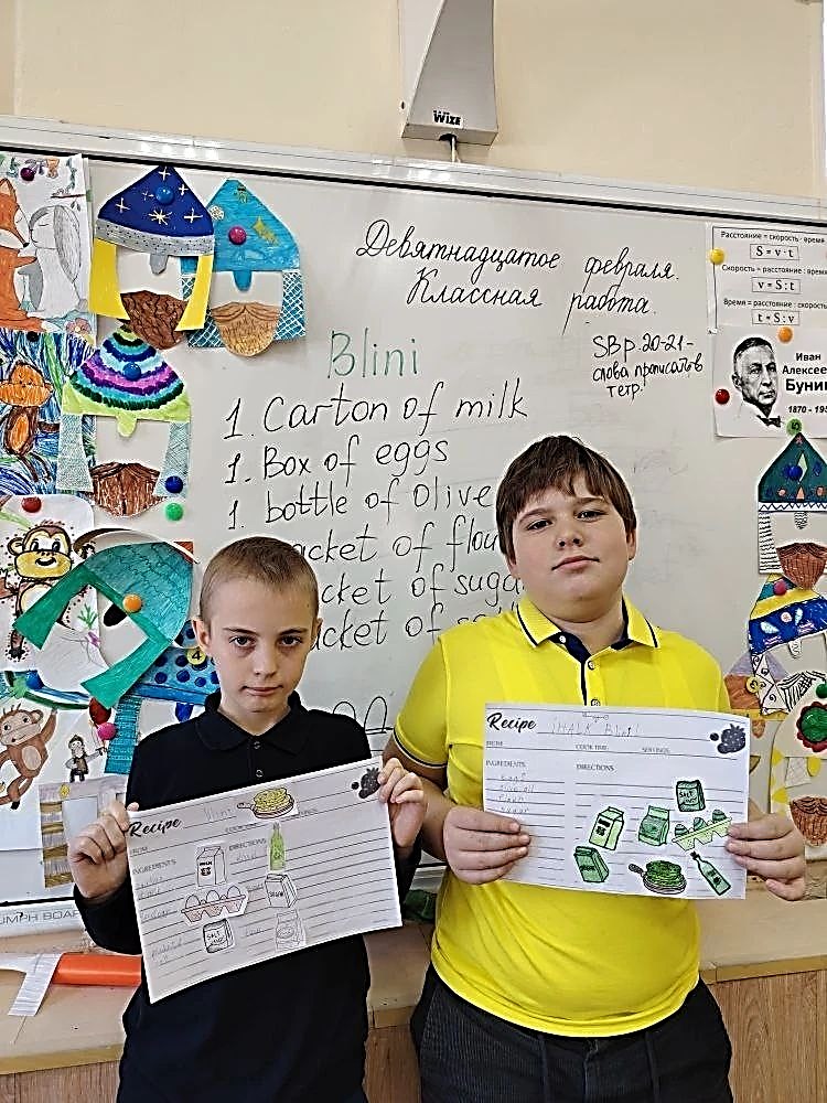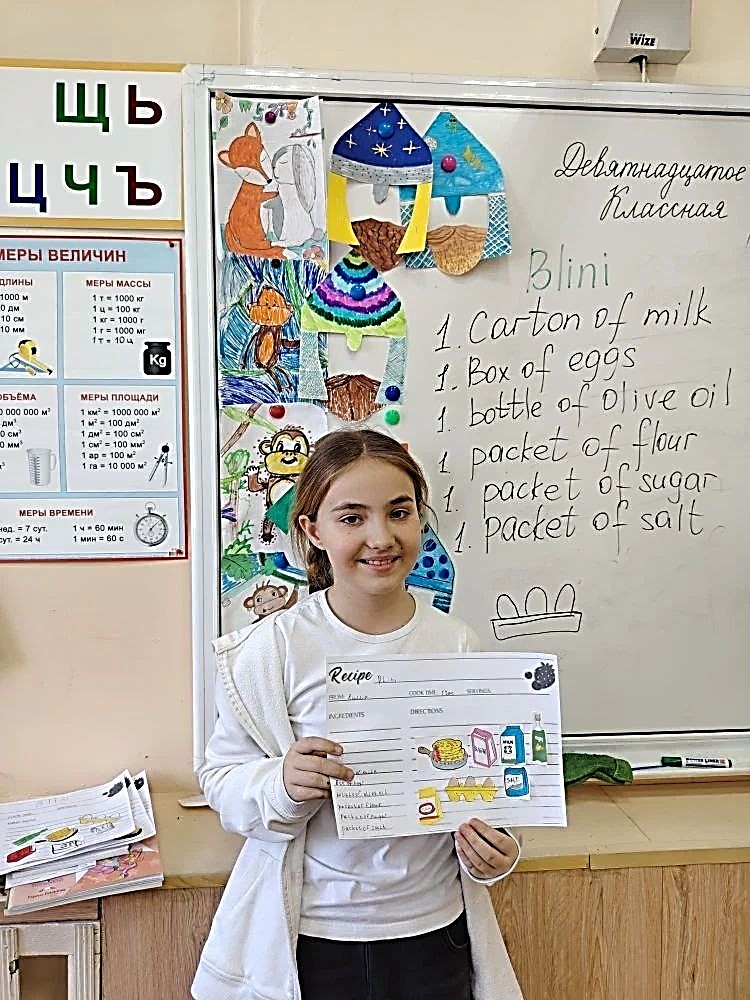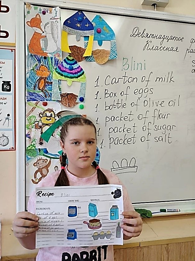 На уроке английского языка в 4 классе по теме «Food and Containers» ребята оформляли рецепты блинов, используя лексику по изучаемой теме.