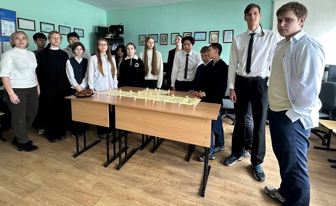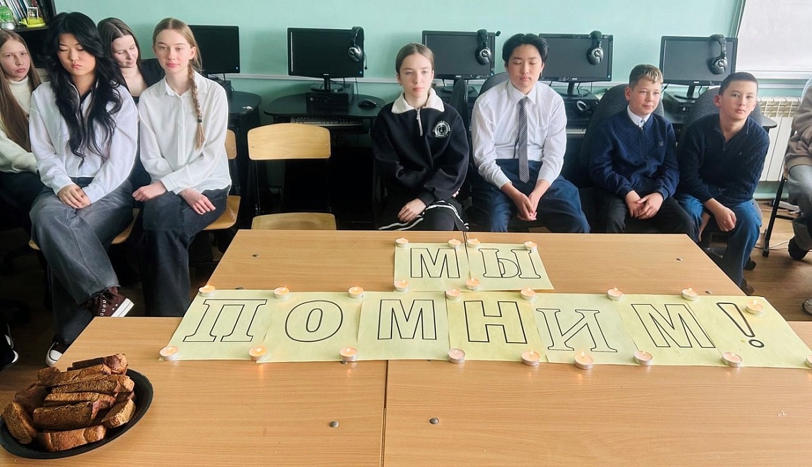 В завершении акции «Блокадный хлеб» школьники из горящих свечей выложили слово «ПОМНИМ» и почтили минутой молчания всех ленинградцев, погибших в годы блокады, а также защищавших свою родину на линии фронта.
