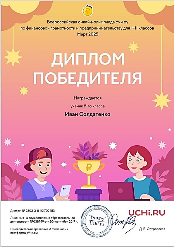В марте 2025 года Солдатенко Иван принял участие во Всероссийской онлайн – олимпиаде Учи. Ру по финансовой грамотности и предпринимательству для 1-11 классов.