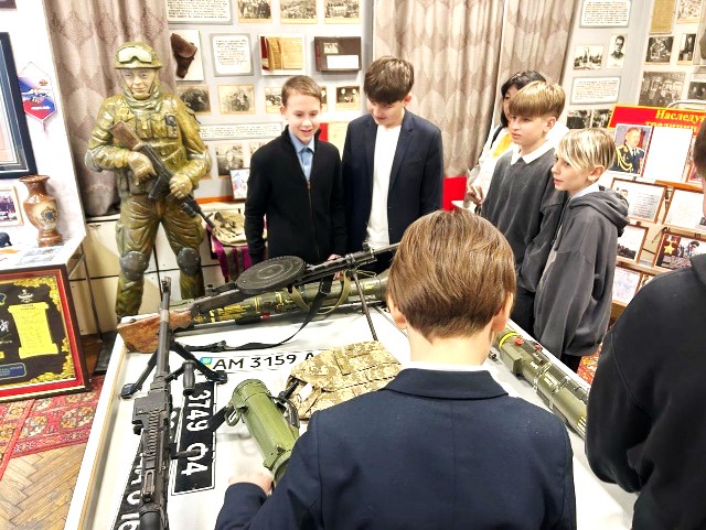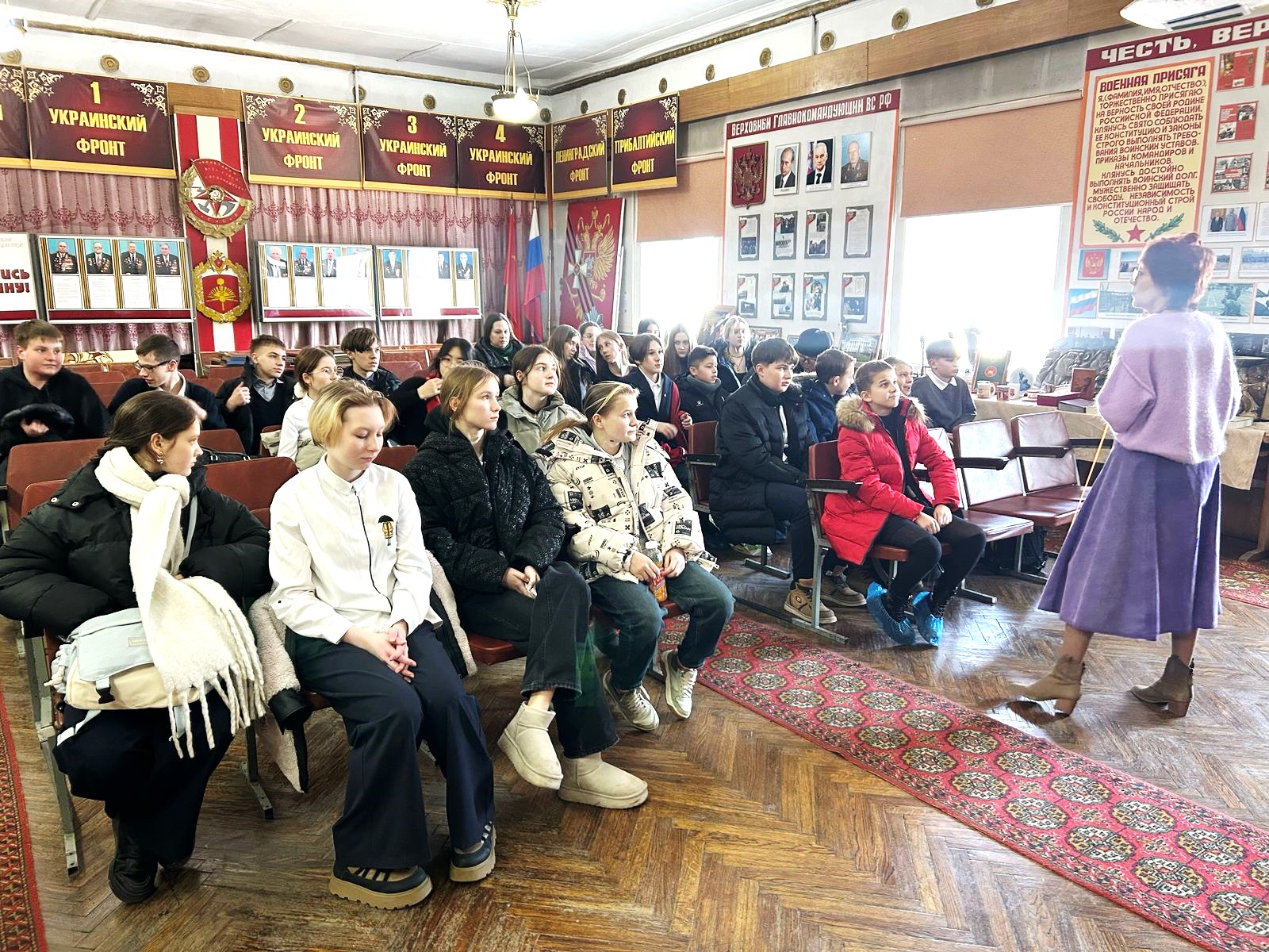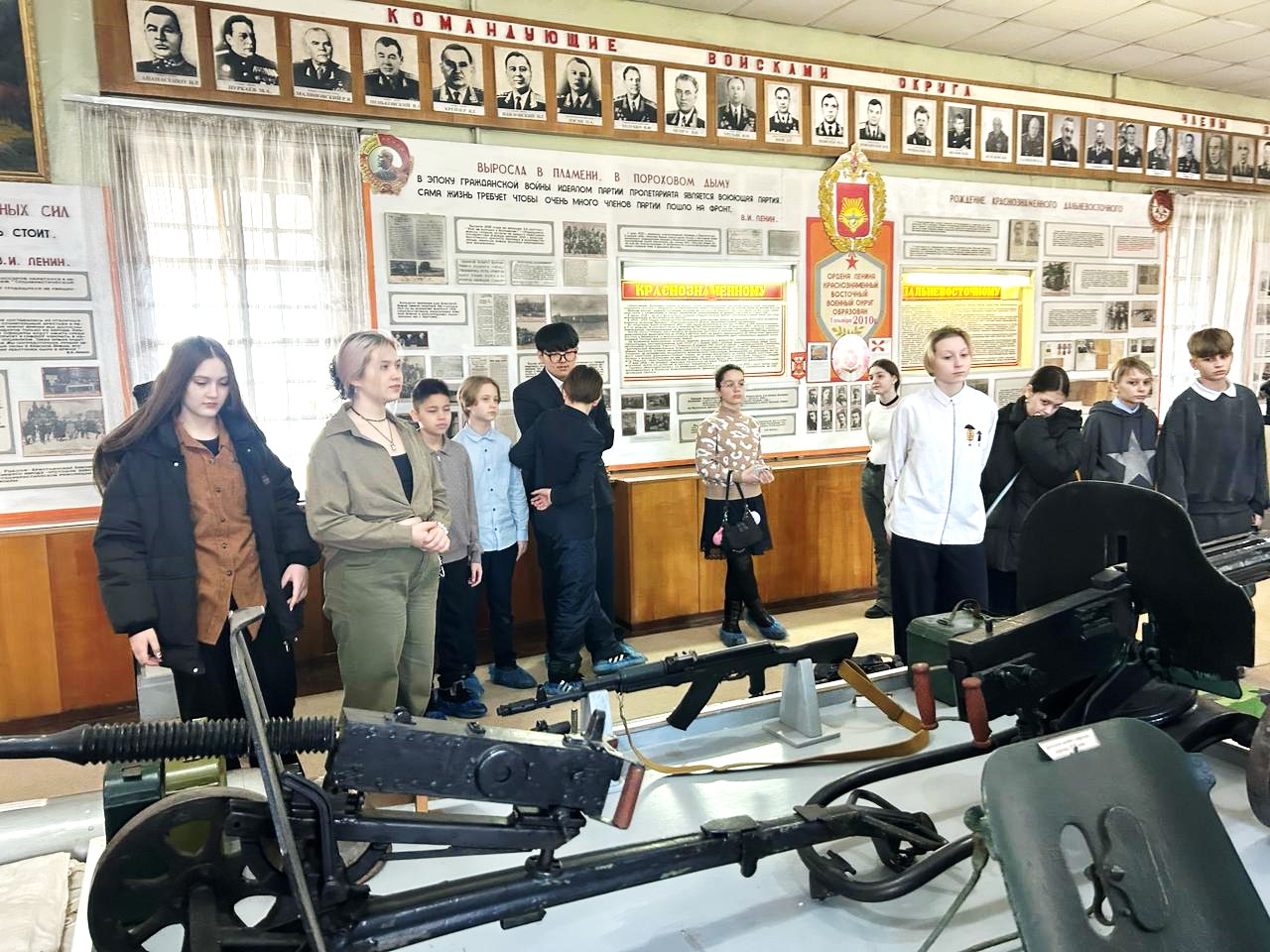 С целью формирования высокого патриотического сознания, чувства верности своему Отечеству учащиеся 6-8 классов посетили музей Боевой Славы Дома офицеров Российской Армии города Уссурийска, где их радушно встретила хозяйка музея Ирина Николаевна, она же экскурсовод. Экскурсия проходила в преддверии двух значимых праздников: 80 – летия со дня Победы и День защитника Отечества.