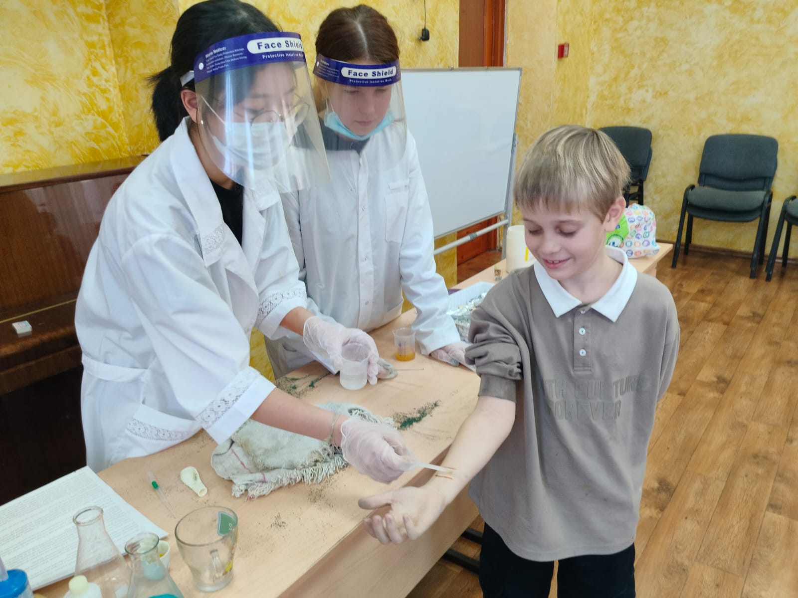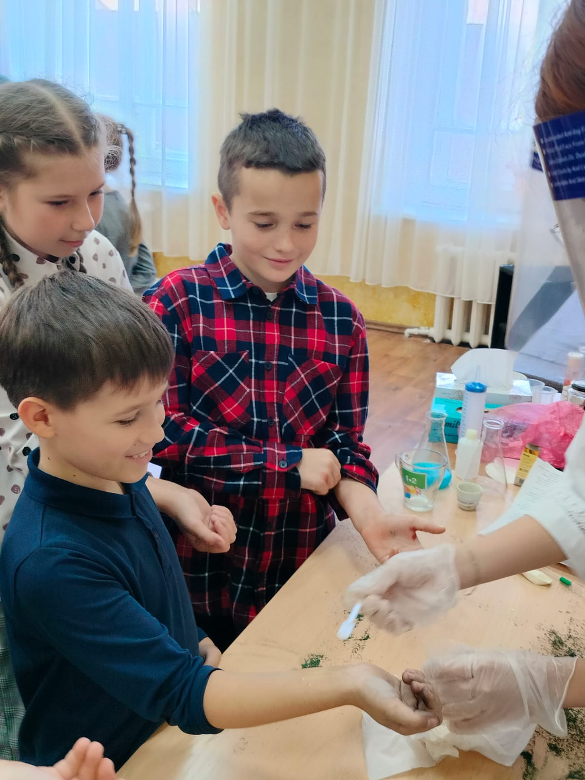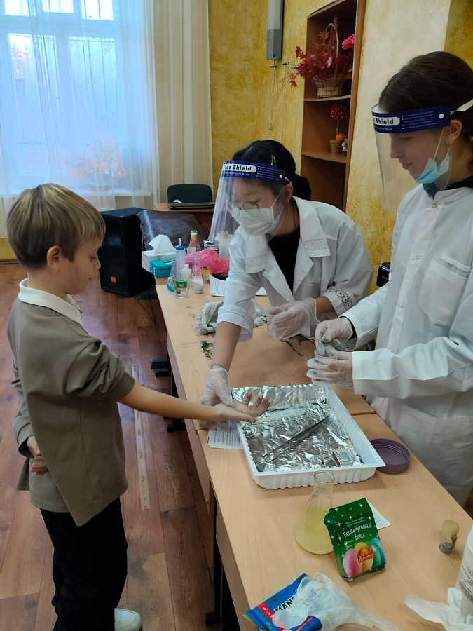 Вот и сегодня в рамках недели химии и биологии волонтерами нашей школы Мун А. и Чикалевой В., учащимися 10 класса и учителем Пасевич А.А. было принято решение провести для детей начальной школы День опытов и экспериментов.