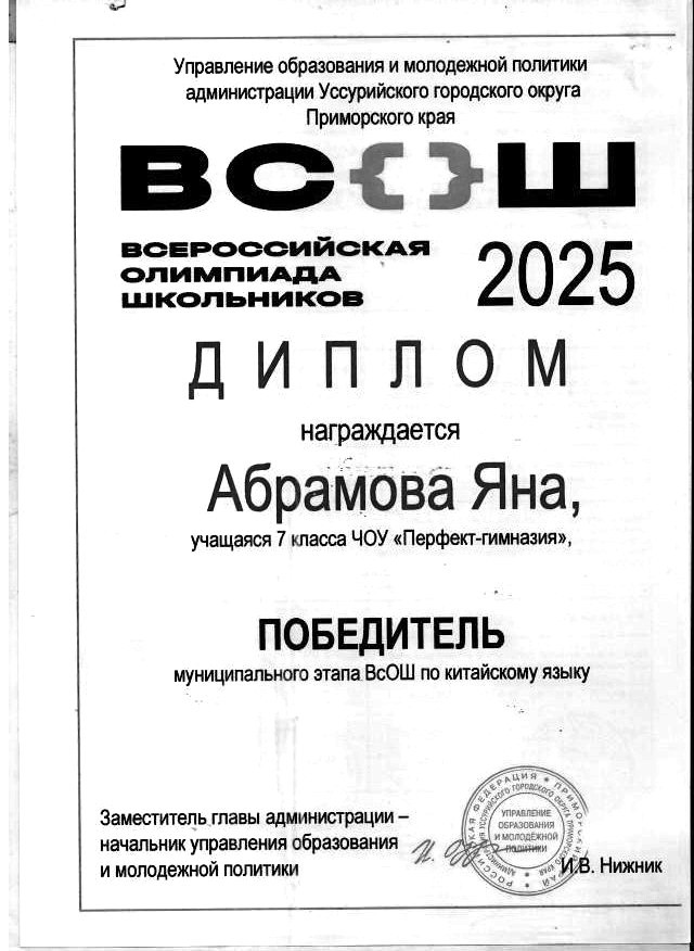 Среди самых активных участников олимпиады Уссурийского городского округа Приморского края была учащаяся 7 класса ЧОУ «Перфект – гимназия» Абрамова Яна.