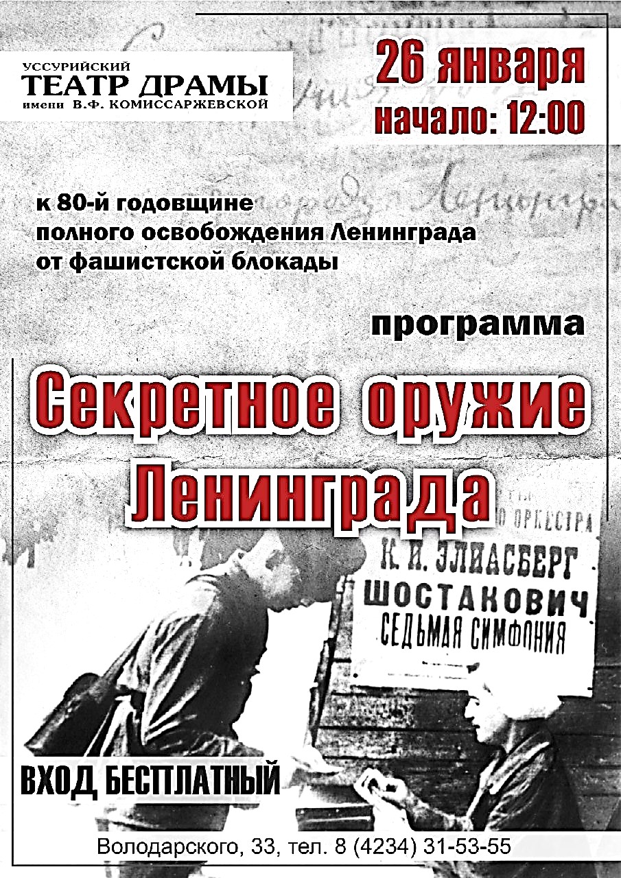 В пятницу, 26 января 2024 года, в честь 80-летия со дня полного освобождения Ленинграда от фашистской блокады учащиеся побывали в городском театре имени Веры Комиссаржевской, где была представлена программа "Секретное оружие Ленинграда".