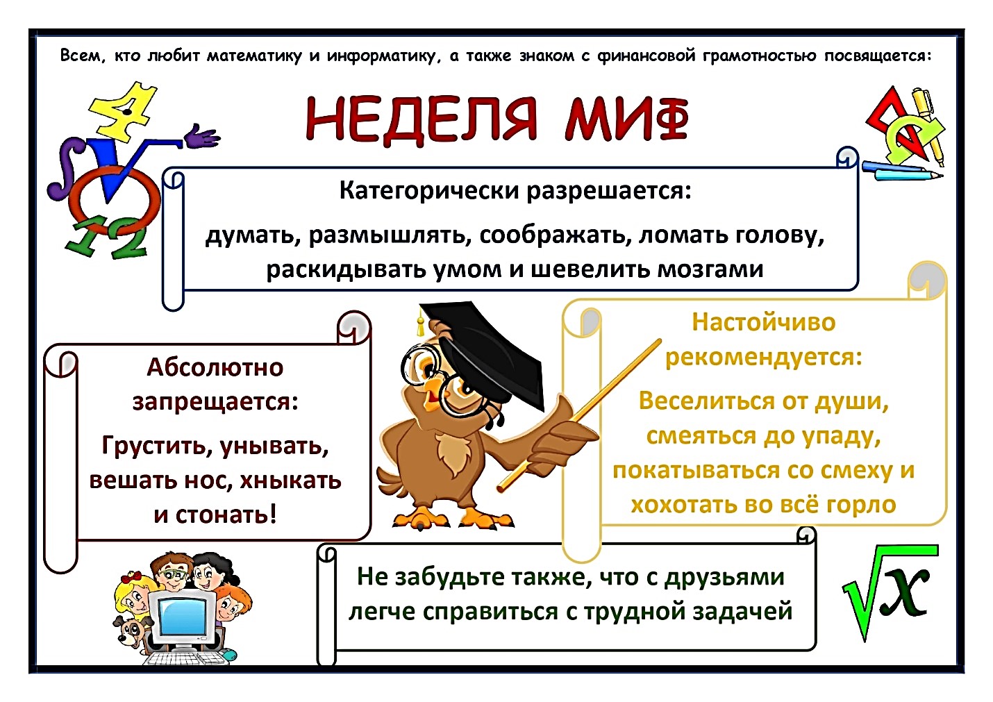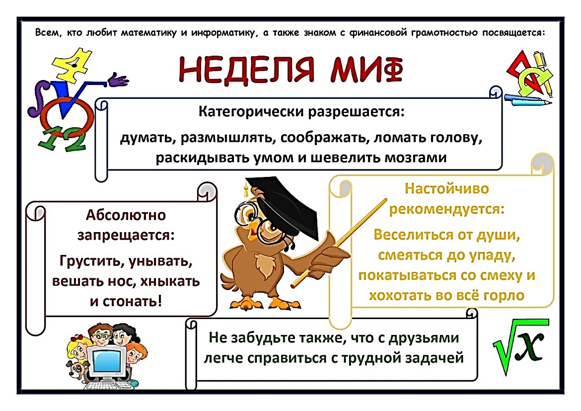 Организаторы Недели математики, информатики, физики приглашают всех ребят принять самое активное участие во всех мероприятиях в рамках недели МИФ, чтобы узнать много нового за рамками программного материала, за рамками страниц школьных учебников.