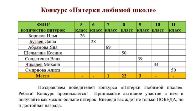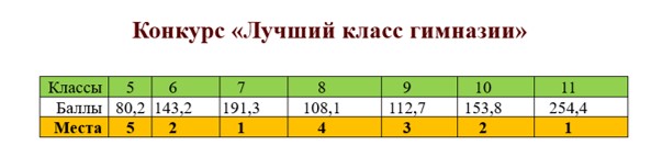 При подведении итогов конкурса за сентябрь месяц было установлено, что среди учащихся средней школы (5-9 классы) первое место завоевал 7 класс (классный руководитель Замула В.А.. Среди учащихся старшей школы на первое место вышел 11 класс (классный руководитель Малыгина Е.А.).