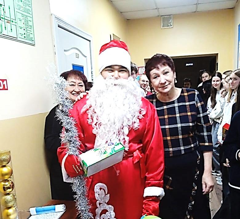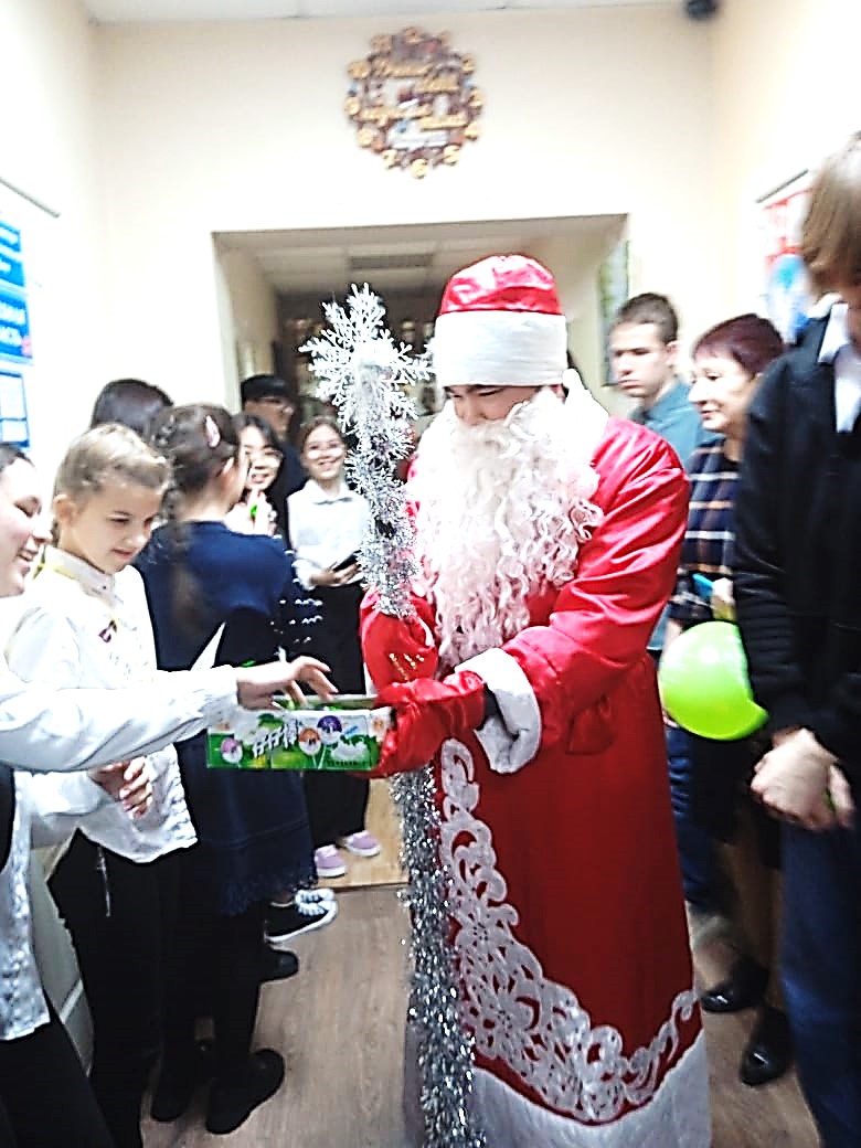 Дедушка Мороз, как герой дня, угостил всех ребят гимназии сладостями.