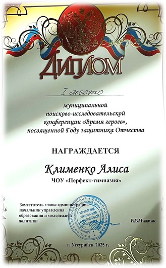 И вот он результат! Учащейся 11 класса ЧОУ «Перфект – гимназия» Клименко Алисе единогласно была присвоена ПОБЕДА! Она награждена дипломом за первое место в муниципальном поисково – исследовательской конференции «Время героев», посвященной Году защитника Отечества.