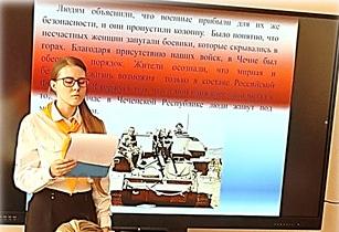 Проводя историко – биографическое исследование о российских воинах, принимавших участие в локальных воинах, Алиса рассказала о своем отце Мухине Валерии Владимировиче, майоре юстиции в отставке, ветеране боевых действий, участнике двух военных кампаний в Чеченской Республике, который в 1995 году в городе Грозном приступил к обязанностям заместителя командира по воспитательной работе в 205 мотострелковой бригаде.